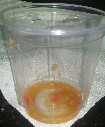 As you can see form the picture above, the seeds are covered by a red, juicy, gelatinous goo that prevents them from sprouting inside the tomato. For the seeds to sprout the gelatinous goo covering needs to be removed. To do this Tania added a half cup of water to the tomato seeds.