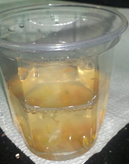 After 5 days the seeds had sunk to the bottom. A thin white layer formed at the top. Tania poured out the water and the white stuff and some of the goo. Only the seeds, separate from the goo, remained. She rinsed the seeds about 10 times to make sure all the goo and the white stuff were properly cleaned out. Then she put the seeds on a Styrofoam plate to dry. She made sure all the seeds were well separated from each other.