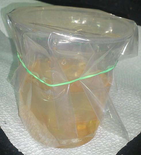 Then she covered the top of the cup with a clear plastic sheet and secured it with a rubber band.