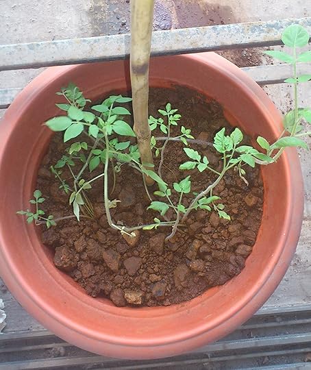 The next day when the seeds were all dry Tania planted them in a pot full of mud that she had got with Tanisha from under the swing in the garden near her house. She made 3, 1 cm deep holes with a pencil and put 4 tomato seeds in each hole.