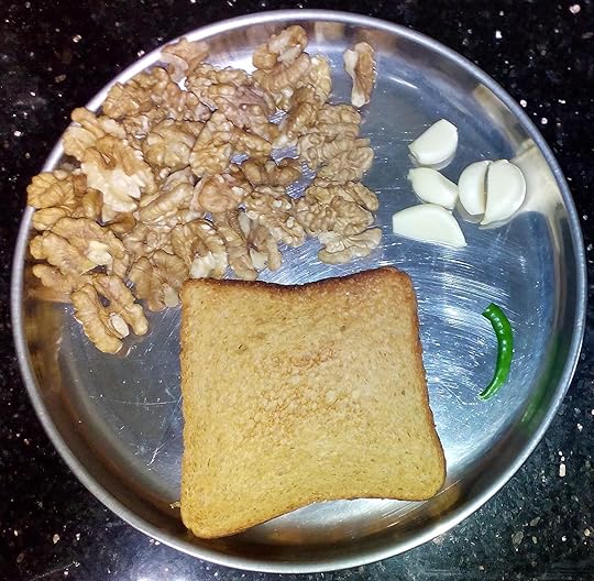 1 whole wheat or oat nut bread slice4 cloves of garlic1/2 green chilli or 1/4 Serrano pepper (optional)
