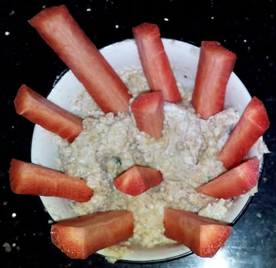 Then mama took it out in to a bowl. Mama also peeled and cut up a red carrot into sticks and arranged them in the bowl.