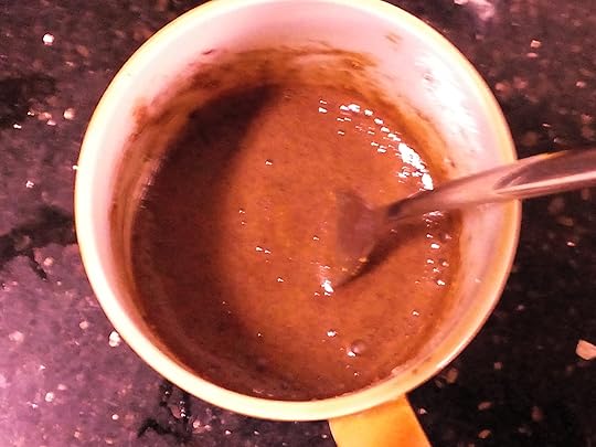 Mama originally found this recipe on http://kurryleaves.blogspot.co.nz/2012/01/chocolate-espresso-mug-cake.html but as you can see, she tweaked it. Particularly, using oats instead of maida (flour) makes the cake both fluffier and healthier.