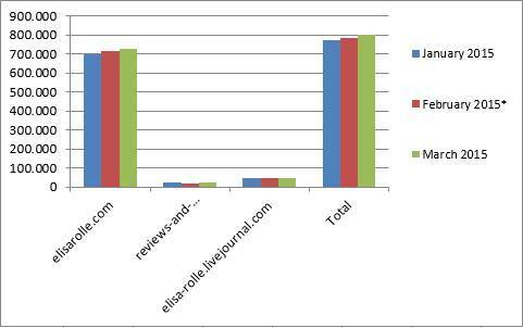 Site January 2015 February 2015* March 2015 elisarolle.com 700.967 716.241 730.077 1,9% reviews-and-ramblings.dreamwidth.org 24.568 21.218 24.122 elisa-rolle.livejournal.com 44.854 45.908 47.159 Total 770.389 783.367 801.358 2,3% *on a 31 days basis