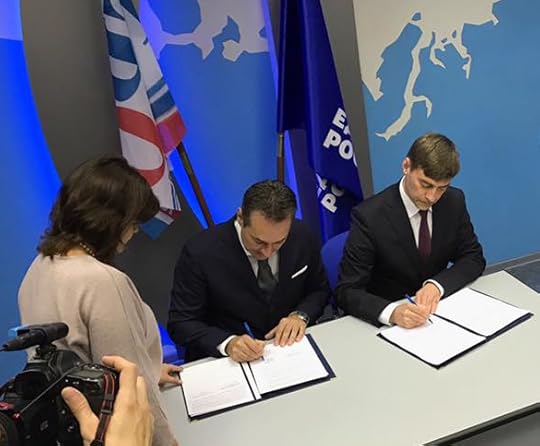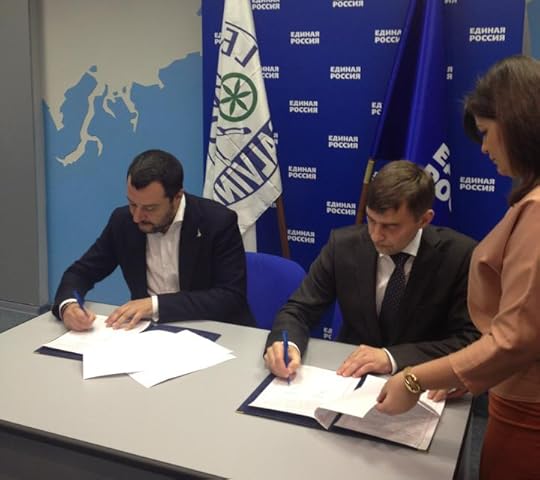 Matteo Salvini and Sergey Zheleznyak signing the agreement in Moscow on 6 of March 2017.