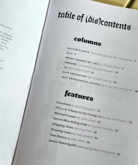 ICYMI: discontentsThis summer I returned to my roots and made a zine with some of my old zine-making friends. The pilot issue features stories on Ceremony, Hsi-Chang Lin a.k.a. Still, and Unwound; interviews with emcee Fatboi Sharif, Coherence director James Ward Byrkit, and Crestone director Marnie Elizabeth Hertzler; pieces by Cynthia Connolly, Spike Jonze, Andy Jenkins, Timothy Baker, Greg Pratt, and Peter Relic; cover art by Tae Won Yu, layouts by Patrick Barber and Craig Gates, and drawings by me, Zak Sally, and Marcellous Lovelace.