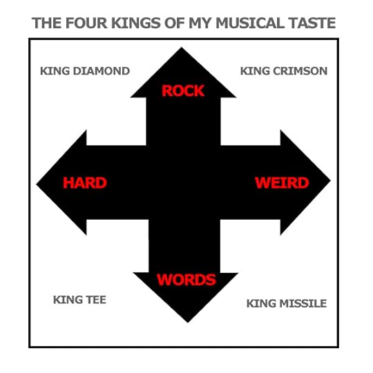 The above chart is my attempt to capture what I like in music. The Four Kings here aren't my favorite artists, but they're representative of the aspects of music I enjoy. I tend to like hard, heavy, noisy, or odd sounds, all with solid lyricism. Clichés are the one thing that I can't seem to get past.