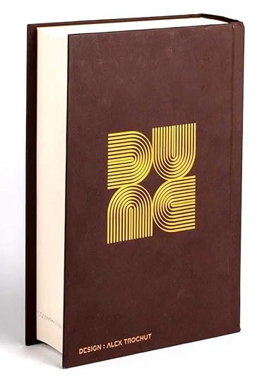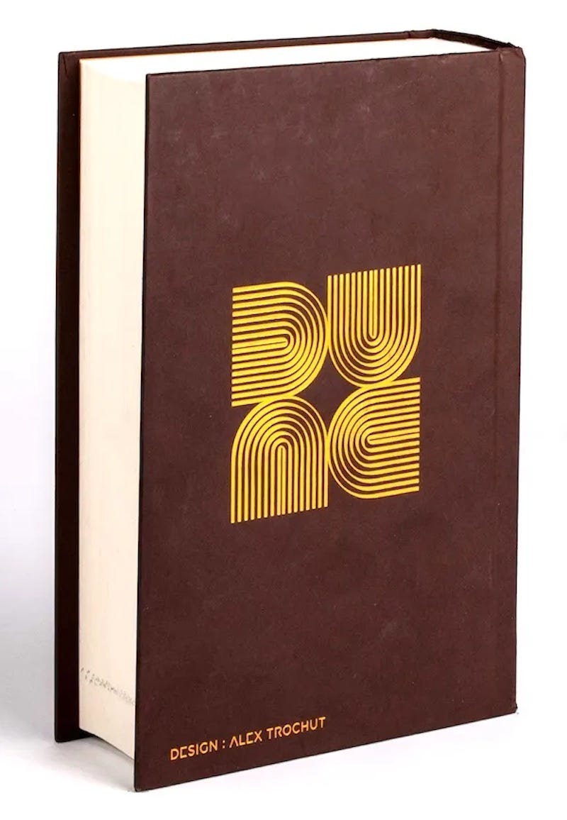 In light of the new movies, Herbert’s novel continues to spread the story. The designer Alex Trochut did the cover designs for Penguin’s Galaxy series of hardbacks, including well-worn volumes like William Gibson's Neuromancer, Arthur C. Clarke’s 2001: A Space Odyssey, Ursula K. Le Guin’s The Left Hand of Darkness, and Herbert’s Dune. Trochut’s Dune logo is perfect. Not only do all of the letters work as a 90-degree tilted version of the same U-shaped form, but the logo itself works when spun to any side. Weirdly, this version appears on the back of the book. Why you would display the word “dune” any other way after seeing this is beyond me.