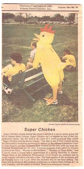 When I was in middle school, I attended a filmmaker’s workshop at Athens State College in Athens, Alabama. We—me and three other adolescents—made a short film called “Super Chicken and the Great Soccer Ball Caper.” A few easy camera tricks allowed the caped chicken (played by me, pictured below in the Athens News Courier) to disappear and reappear in different scenes. I popped in and out of a soccer game that was happening on campus and saved the ball somehow. I don’t really remember what little there was of a plot.
