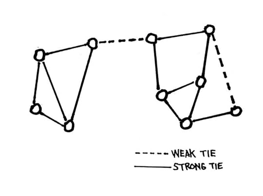My Sharpie rendition of The Strength of Weak Ties.In the late 1960s, Mark Granovetter was studying how people found jobs. His 1973 article in the American Journal of Sociology, “The Strength of Weak Ties,” states that each person in a close social network is likely to have the same information as everyone else in that network. It’s the weak ties to other networks that lead to the new stuff. That is, weak ties are a more likely source of novel ideas and information—regarding jobs, mates, and other opportunities—than strong ones. Granovetter says, “I put the theory of weak ties together from a number of things. I learned about hydrogen bonding in AP Chemistry in high school and that image always stuck with me—these weak hydrogen bonds were holding together huge molecules precisely because they were so weak. That was still in my head when I started thinking about networks.”