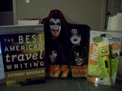 That's right! You're not seeing things. That is the KISS trivia game in keepsake tin box alongside the Spongebob Squarepants digital thermometer! See that big blocky safety head? Now I won't keep losing thermometers in my colon (YAY!!!). Synde got me the Travel Writing book, which I totally love and if I could would be my second job for sure. She was thoughtful enough to wrap it in this lovely paper...