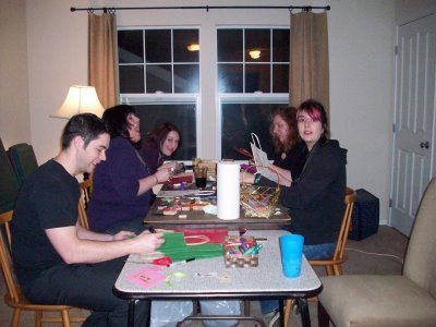 Remember when I said holiday craft time? Well I wasn't kidding. Here in this candid but, I think you'll agree, poignant still life, Team Seattle (and auxilliary, but minus Kat and Richelle), make with the creation of gift bags and tags...