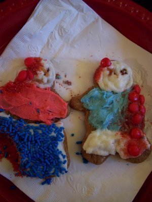 My primary order of business was the creation of the ultimate in zombie cookie outbreaks, but the best I could manage were this pair of corpses suffering from matching traumatic brain injuries (I am particularly proud of the gingerbread man's severed arm gore)...