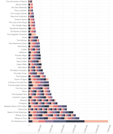 Some of these were surprises to me, others weren’t. I don’t think many people will be surprised to see the Wheel of Time or Discworld towards the top, but I was surprised to see just how long the Redwall series was (apparently all those books really add up) and apparently Raymond E. Feist’s Riftwar Cycle kept going for way longer than I ever realised.