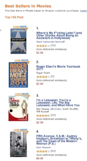 For me, publishing is a long tail business and Where's My F*cking Latte taught me that firsthand. This is a book that first came out in paperback in 2007, then for the Kindle in 2008 and then by 2009, started inching up the Kindle bestseller list for TELEVISION. For the most part it has sat at #1 on that list for the last 3 months. Just lately, it's crawled up to the top of the MOVIES bestseller list as well. I'm happy to say that, at least for the moment, it's #1 on both lists. I'm even outselling Roger Ebert's book! Not bad for an indie.