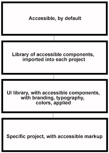 At the second layer of abstraction, you have a code repository you can import at the beginning of a project which allows your developers to re-use code that meets accessibility standards.