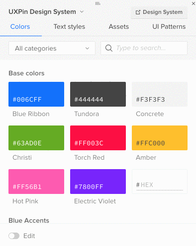 Ability to edit colors and assets in Design System Libraries and Design Systems.