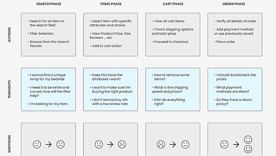Thoughts — Quotes of what the user is thinking, i.e., “I wonder if there’s an example?” or “I hope this doesn’t take long.”Feelings — The user’s emotional state, i.e. “is confused by the navigation and blames themselves.”Actions — The user’s behaviors, whether in general or in response to a specific instigator, i.e., “returns to the home page every time they don’t know where to go.”