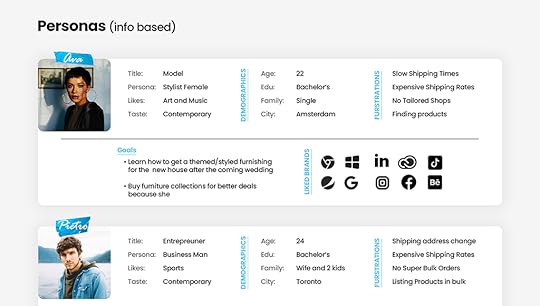 Sights — Where the user’s eyes go, i.e., “loves the colorful mascot.”Quotes — Things the user says, similar to thoughts. Can be pulled word-for-word from user interviews, or based on existing knowledge.Influences — What the user has heard from third parties that might influence how they act, i.e., “They say this is easier to use than Photoshop.”In addition, at the bottom in some empty space, it’s always a good idea to include: