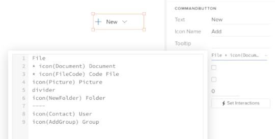 Icons & Text in MenusLet’s look at how a user would add popup menu items to a CommandButton control in UXPin. In this example, the user clicks on the button with the text “New” to display a popup list of the types of objects the user could add, such as various file types, a folder, a user, etc.
