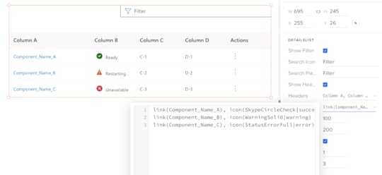 The UXPin Editor view for the DetailsList’s Rows prop showing the comma-delimited cells (CSV format) with our innovative link() and icon() syntax.
