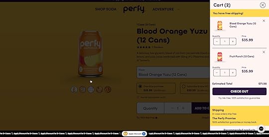 Shopping cart drawerPremium soda brand Perfy uses bold colors and UI elements to reinforce its brand and product range. A drawer opens when someone adds a product to the cart, revealing the shopper’s basket with a CTA to checkout.