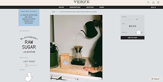 Above the fold product pageLike Popcornopolis, Verve Coffee Roasters uses an above-the-fold, 3-column product page layout. Ample whitespace surrounds the primary CTA with price and quantity selection to help the most important prominent. The product details use keywords rather than lengthy descriptions so that users can make a decision quickly.