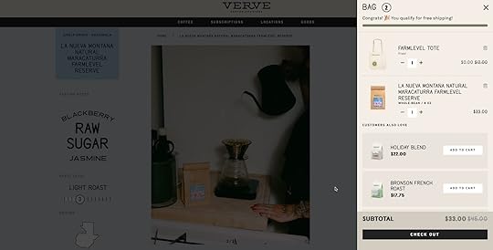 Verve’s cart drawer informs shoppers about free shipping while recommending related products to increase transaction value.