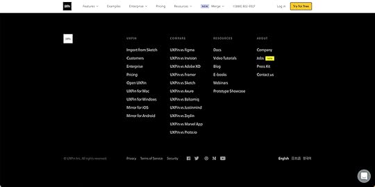 UXPin’s footer includes key company, product, and marketing information. Customers often want to know how UXPin, an advanced tool, compares to popular image-based competitors, so we’ve included several product comparison links.