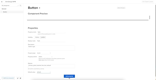 Property name: enter “type” (always use lowercase for props)Display name: This is for your reference, but something descriptive that both designers and engineers use–we’ve gone with “Type” to keep things uniformDescription: Add a short description or instructions for designers–we’ve used “Type of button”Property type: “enum”–allows you to create a dropdown display the six stylesProperty control: “select”Options: Add the options from Ant Design’s API docs–primary, ghost, dashed, link, text, defaultDefault value: Your preference–we’ve gone with “default” as per Ant Design’s docsAs you complete the component’s properties, you’ll notice a component preview will appear and change according to your preferences.