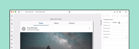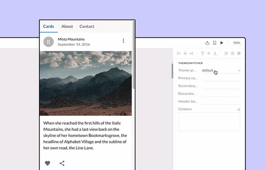 Focusing on the Theme Switcher, you can see that it’s just a React component. It shows that anything you can imagine and code can be designed within Merge. It shows how agencies that use Merge can work efficiently with any number of clients, switching between clients’ brands with a click of a button. It’s also an incredibly powerful tool when it comes to requests for proposals (RFPs) and quick-turnaround demos. Imagine if all you had to do to create a new styled prototype to impress potential clients was to edit a simple style file, while your competitors had to create a new prototype from scratch. But, how is this different from using another piece of software and their theming tool?