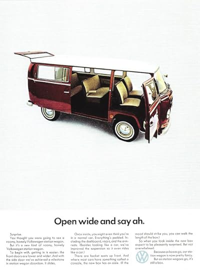 It was the heyday of the station wagon, so they marketed the bus as a wagon. No one had heard of minivans. All the VW ads of the--even the headlines-were written in plain simple English, with correct punctuation and set in a clear, clean sans serif type. The print ads all spoke with a straightforward, lightly ironic voice, playing against the hype and bombast that characterized most automotive advertising of the era. And they had to overcome the German thing. This was only 23 years after the end of WWII. We have posted a slightly later-c. 1975-VW bus of this era from Blue Hill, Maine. Maybe out favorite bus is a 1966 VW Transporter from West Texas.