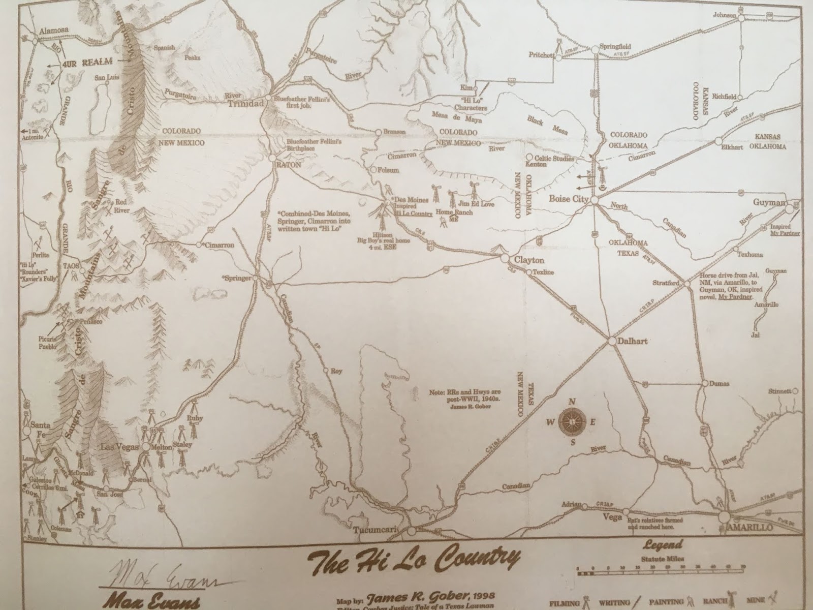 The Hi Lo Country Map by James R Gober 1998I did not know very much about the Hi Lo when I first started going there. What made me want to go there was the empty space on the map. Over the last few years while adjunct teaching at Colorado College I have made several weekend explorations through the Hi Lo. For a lone traveler in a car, in some ways there is "nothing there". The overwhelming fact is space--empty land and sky. The towns are not towns you've ever heard of until you get there--Clayton NM, Springer NM, Boise City OK, Dalhart TX. This is ranching country and in years when there is enough rain it's some of the best cattle range in the world. It's almost entirely private land. There's no BLM or National Forest management. You don't see a lot of cattle because the ranches are huge and far apart and cattle have to be ranged sparsely for ranching to be sustainable. I don't know how many hundred acres it would take to sustain a cow/calf in a good year. In a bad year I would imagine the price of hay is very high and a lot of breeding stock get shipped. I'm posting 2 maps of the Hi Lo which I've just come across in Max Evans' Hi Lo Country: Under the One-Eyed Sky, text by Evans and photographs by Jan Haley. Evans is the writer who gave the region its name with his novel The Hi Lo Country.. Still have not seen the Woody Harrelson movie, based on the novel. The novel is an intriguing roughhouse story set in a ranching country that reminds me of the ranching world I found in the Alberta foothills in the early 1970s, working on the GH Ranch in Sundre, Alberta as a very green hand lucky enough to ride sometimes in company with wonderfully skilled Alberta cowboys like Jack Gill and Sid Cunningham.