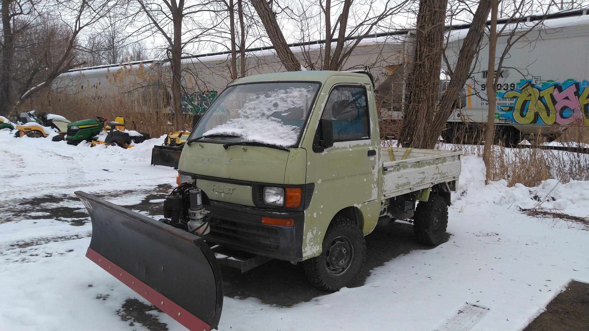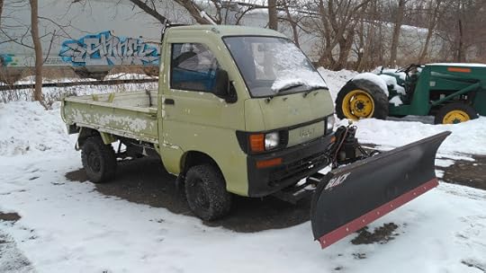from Reid Cunningham: "I finally caught one of these in the wild in Victor NY. Rough around the edges and no plate. Reminds me growing up when every garage seemed to have an old battered Jeep for plowing out the parking pumps. The one down the street from where we lived in the early 70's was even a week worn forward control Jeep. Red of course, did they even make them in another color? All those old Jeeps either dissolved to rust or are now too valuable as collector vehicles. Kei trucks may be the new version. "