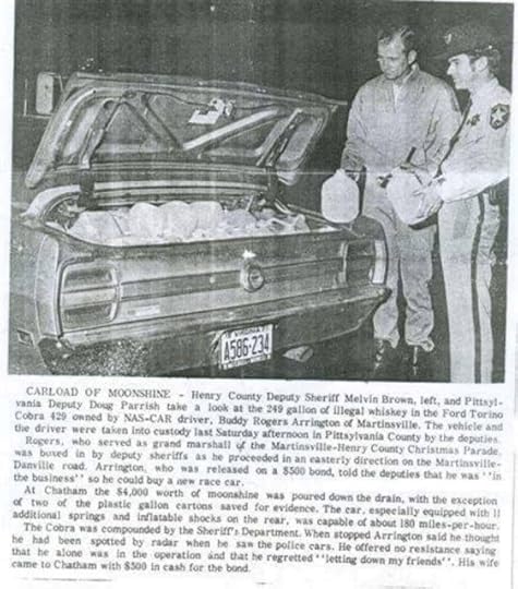 in the Washington Post (March 10, 1981)"What's going on here is that a garageful of good ol' boys from around the moonshine capital of the U.S.A. are building a race car for Buddy Arrington, the last of the convicted 'shine runners still racing alongside Richard Petty and the slick kids such as Darrell Waltrip and Dale Earnhardt..."We're in Martinsville, Va., 3 1/2 hours southwest of Richmond. This is the county seat of Henry County, which along with neighboring Patrick County and Franklin County is what the American Temperance Union used to call "the wettest place in the United States." The beautiful little race track just outside Martinsville is owned by Clay Earles, who won't say he ever ran 'shine but will point proudly to a picture on his office wall..."