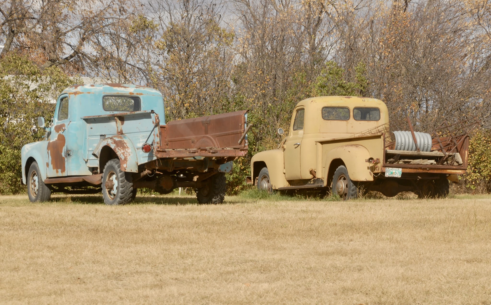 from Alex Emond in southern Saskatchewan: "Complimentary colours. International Harvester and the blue Fargo. On the road to Gravelbourg."AL: Ils parlent français là-bas. Fransaskois?More Internatiionals: a KB.