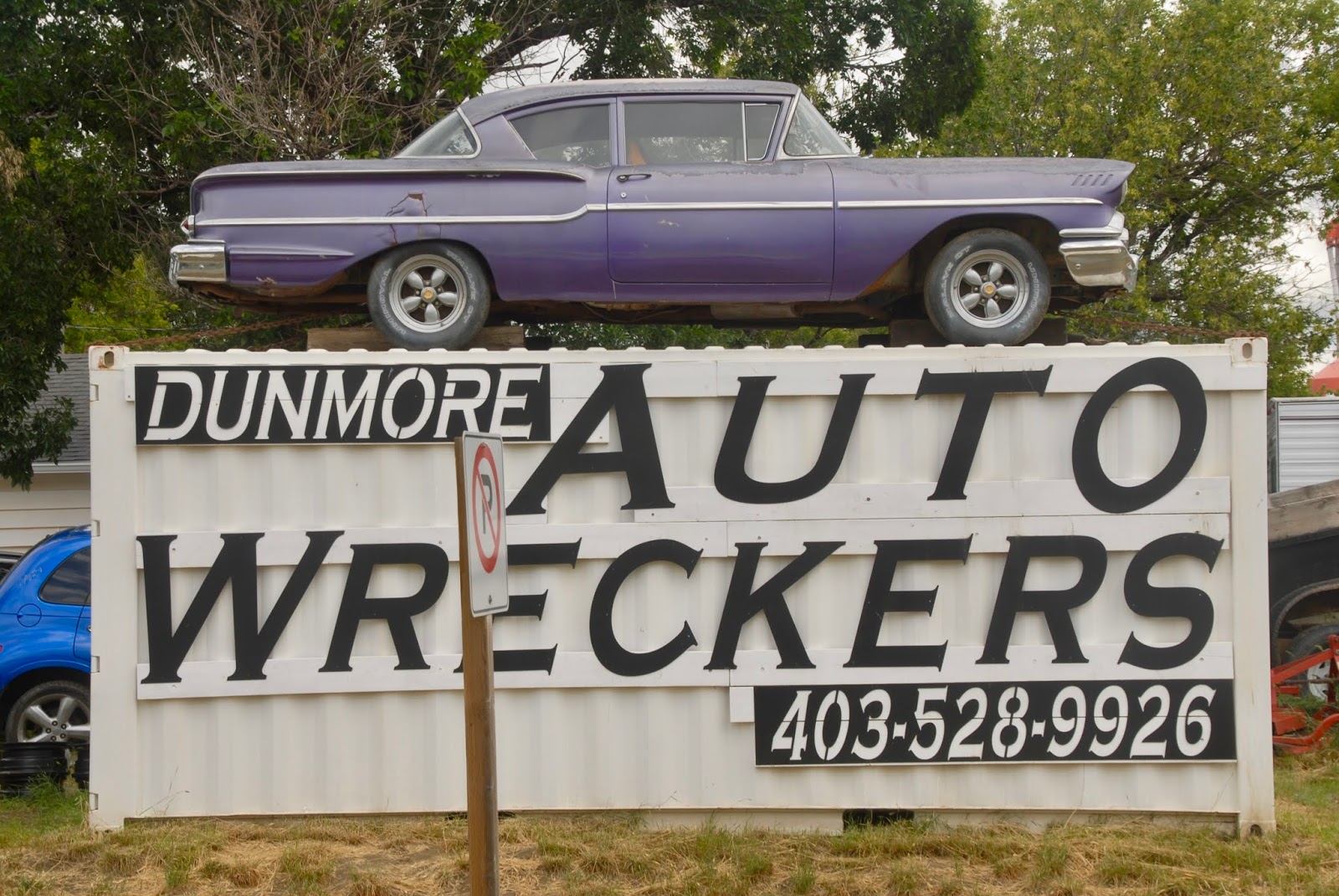 From Alex Emond: "Dunmore is a small community that's just a little bit east of Medicine Hat , Alberta . Here's a sign that's hard to miss . You can be sure that this car didn't start out purple." AL: we've posted other '58 Chevys. It was a good-looking car that stood out in a motel year that was otherwise known for chrome-clad Belchfire monstrosities. A Yeoman station wagon, up in Maine.A Brookwood wagon in Cimarron, NM.A Del Ray sedan in Colorado Springs.A Biscayne in Oakland.A Biscayne in Quebec, and another Biscayne in Maine.