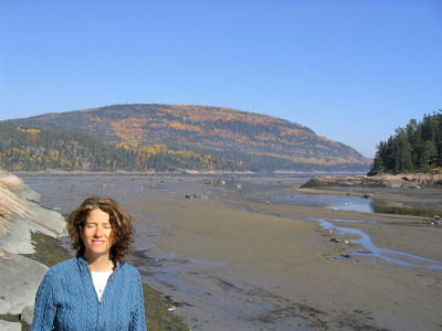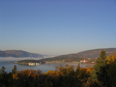 ...Sunday morning grey skies in Québec exaggerate a sense of northern bleakness. Post-Catholic countryside sports bar salons and plastic road-signs advertising danseuses, sometimes nu. The ferry from Rivière-du-Loup takes an hour and a half to cross the St. Lawrence, which is tidal and smells of the sea. Tadoussac must come close to a European fantasy of Canada. Busloads of francais de France have day-tripped down from Quebec City. Tiny wooden town, rough Laurentian hills, birch trees pulsing yellow.
