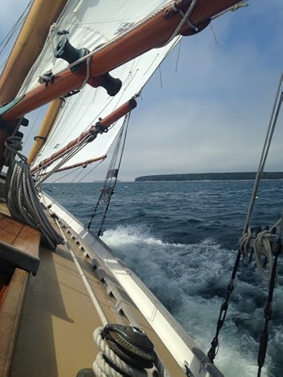 That's the schooner Malabar II, John Alden design, (1922) on 18 knots of SE breeze, out in Jericho Bay yesterday.