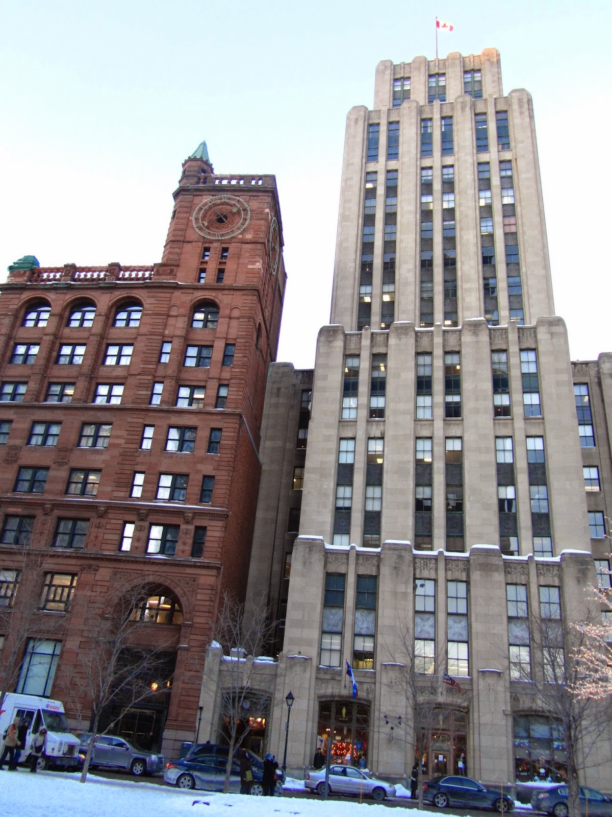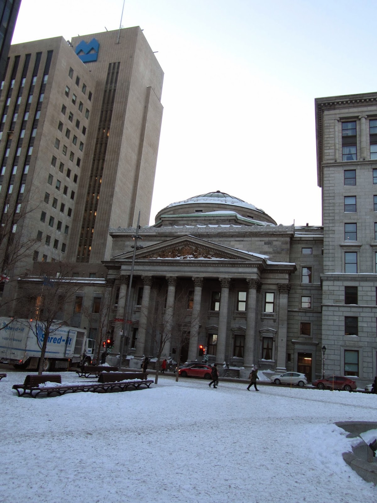 I stood in one spot on the Place d'Armes and turned 360 degrees to shoot (not well) a set of buildings in wildly different styles of architecture, ranging over three centuries. We must return to Montreal when the weather is a bit more clement to do an effective set of posts on the city's morphology, neighborhood by neighborhood. (That's a ten-dollar word for "size, shape, structure.") And there are certainly some cool trucks and cars in La belle province, but they are all tucked away and hibernating now.