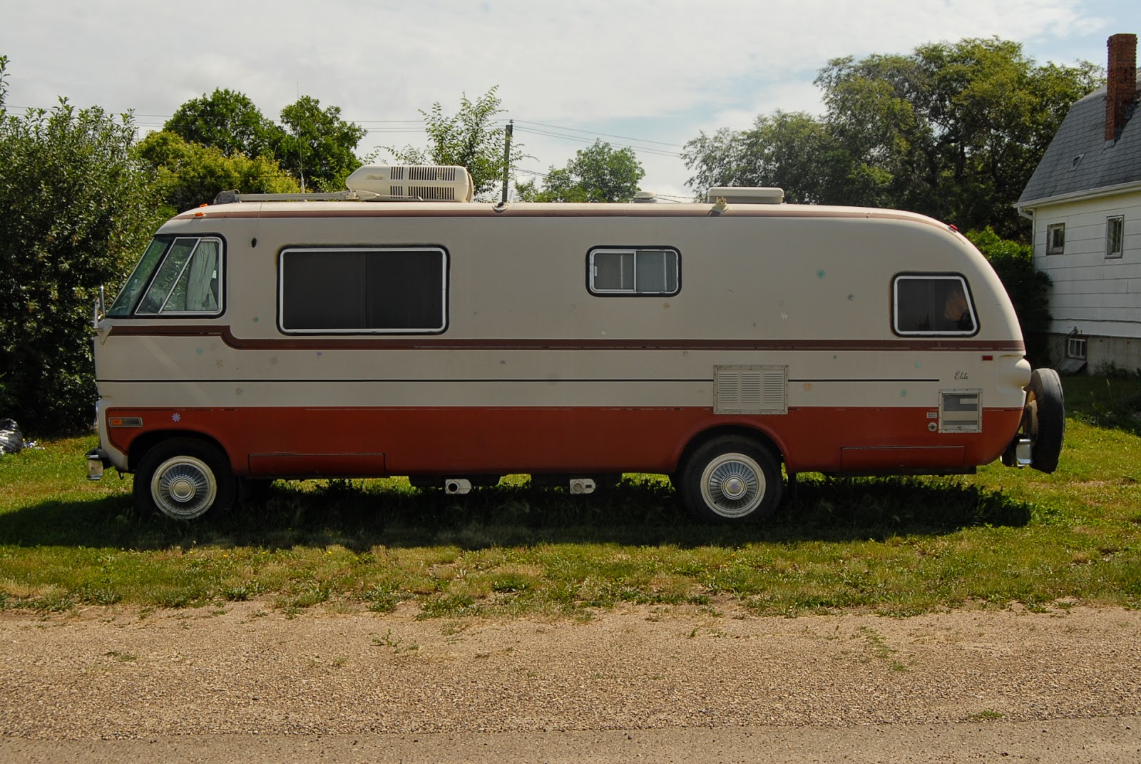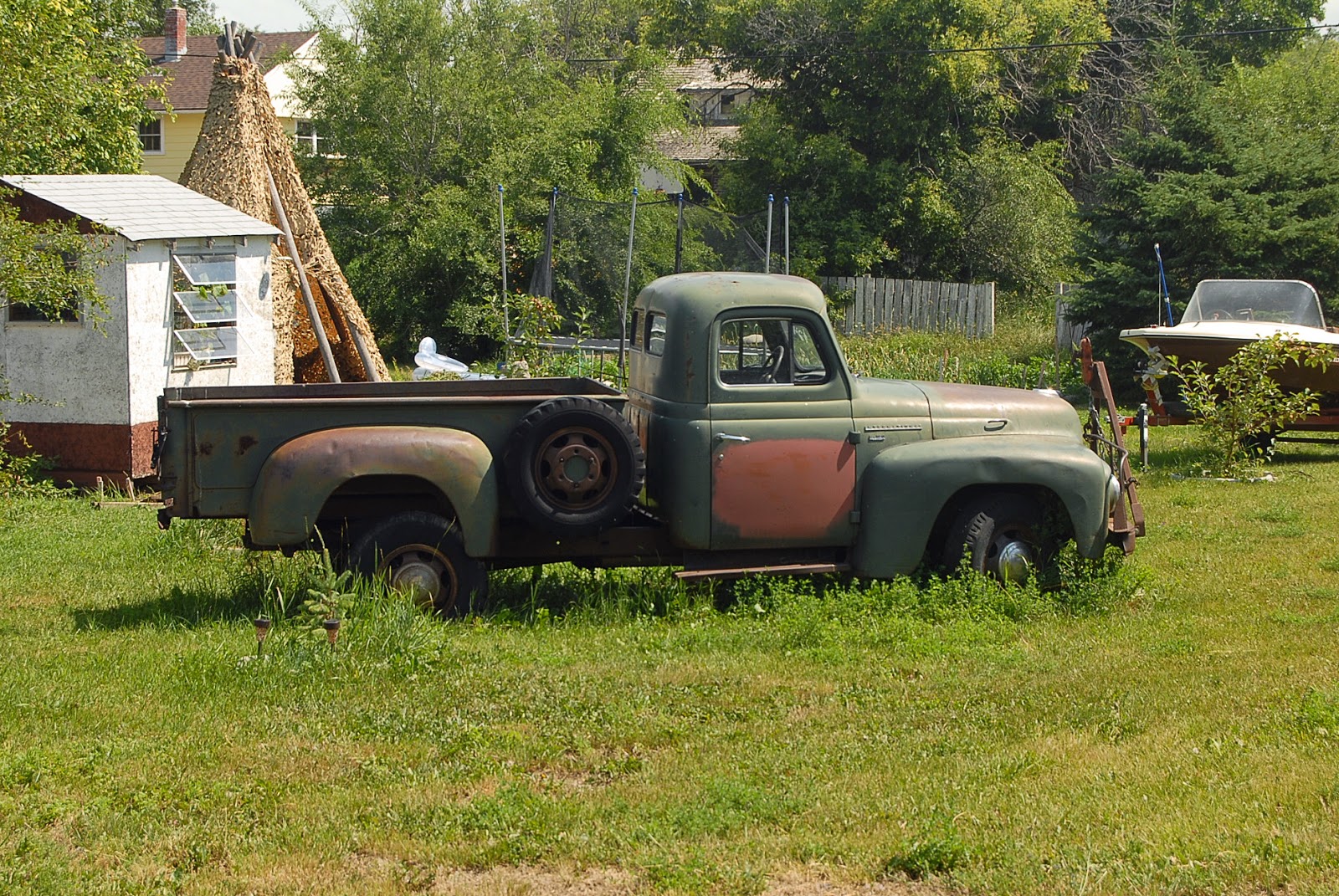 These notes from Alex Emond came in last fall, from Saskatchewan:"This fine Chev, which is pretty much exactly my age, pushing 64 , was in Kinkaid, Saskatchewan . Pa-tee-na! (And check out this one-ton chevrolet panel truck--AL) Around the corner and across the street is the mighty impressive Travco motorhome. Note the buffalo skull on the dash. That's yet another International Harvester truck in the yard. Quite a few IH trucks around because farmers were already using their tractors etc. so there were dealerships. Cheers."-AE