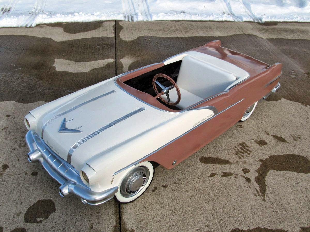 The Junior Star Chief was built for Pontiac Dealers to promote the new 1956 Pontiac. They were given away to lucky children through a variety of contests. These great little cars are approximately one third the size of a real 1956 Pontiac. They were the brain child of Jack Stuart a Designer with Pontiac's promotional division. Junior Star Chief production was contracted to Silvestri Art Studios of Chicago Illinois by Pontiac. The body is made of fiberglass. The steel chassis is powered by a 12 volt battery which powers a real Pontiac starter motor. Features include: Forward and Reverse, Foot Operated Brake. Working headlamps, working tail lamps, and a working horn.Thanks to Alex Emond for the heads up. One of these is for sale at Hemmings.