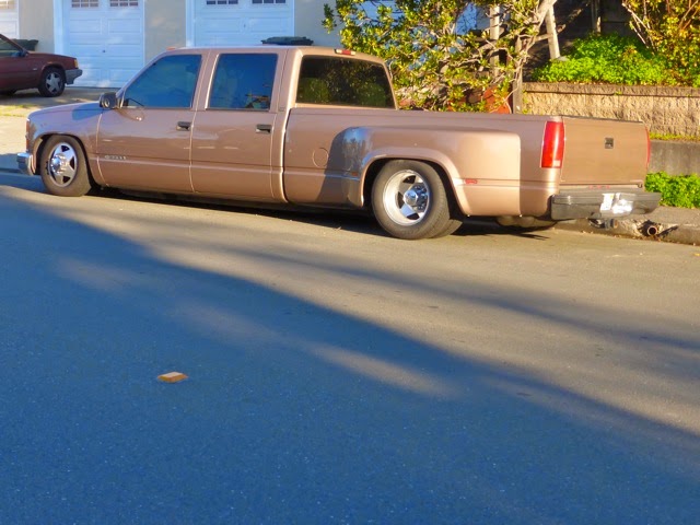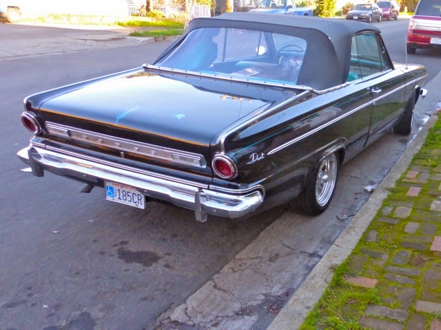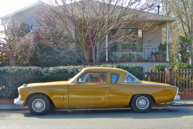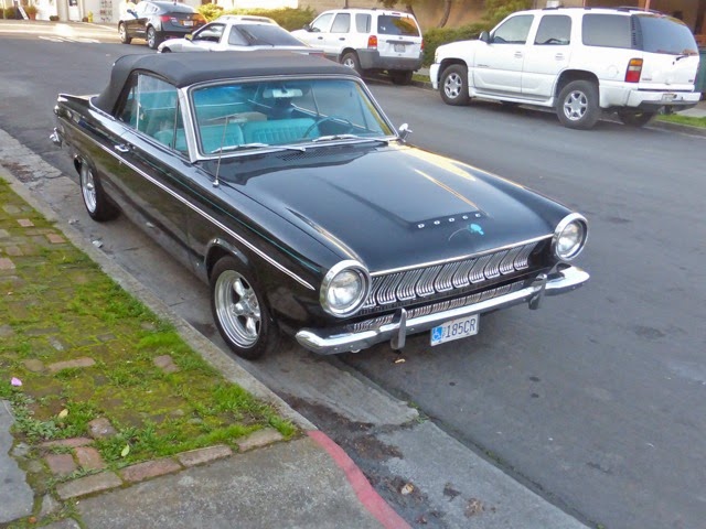 From the painter Michael Moore, in the Bay Area: "Now just wrapping up a foggy week in Benicia and wishing I'd gotten some pics of the cherry Studebaker Commander at the transmission shop in Vallejo, but I didn't, and it seemed most everything around here was parked against the sun...nonetheless, a golden Stude on Military and, cuter still, this black Dart convertible...dunno anything about either of them except that they were around downtown Benicia of a Wednesday in January...The long truck, weird as it is, belongs to my neighbor Dave the Barber, I think..."-MSM