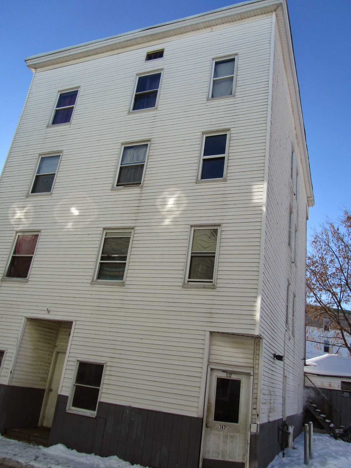 After lunch I headed for...Little Canada. The housing stock there is smaller, tighter, denser, than in other New England mill towns. In much of the region, the three-decker wood frame tenement or apartment house is standard. But when I asked about three-deckers in Lewiston I was told, "Three-deckahs? In Little Canada? Foh-deckahs!"