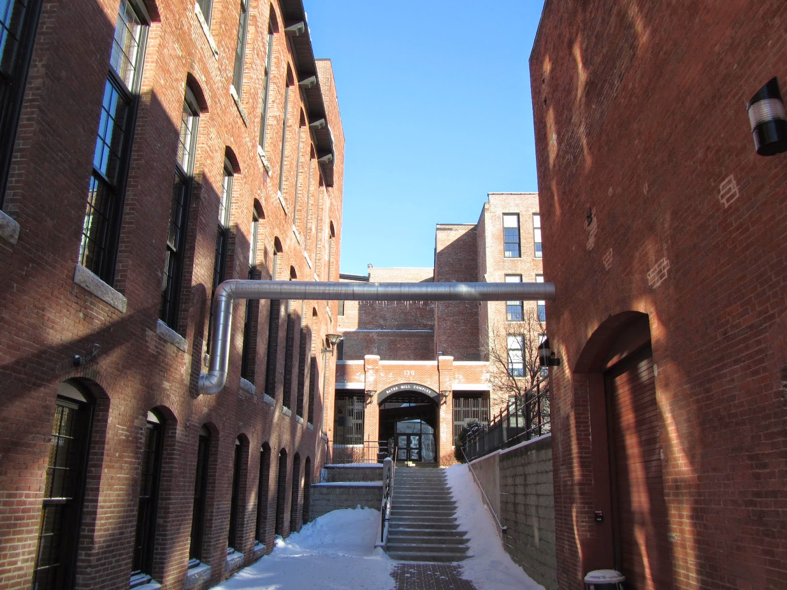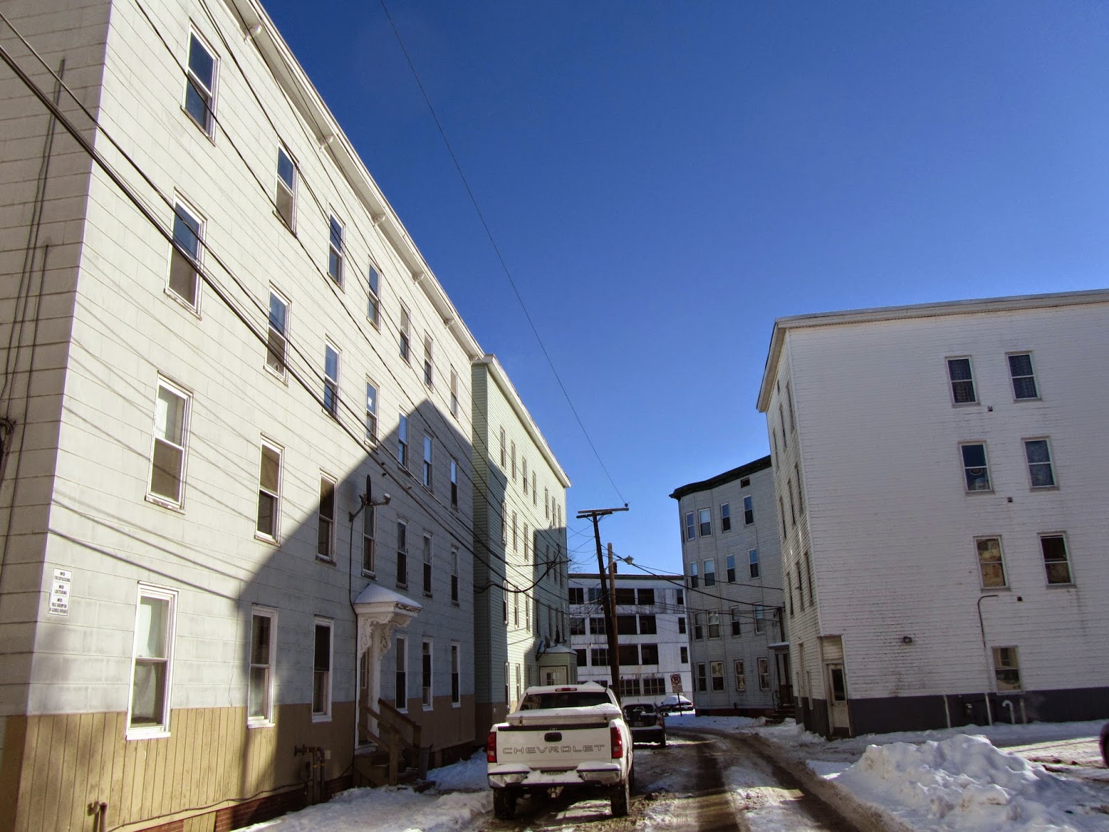 If you're seen AL posts on Biddeford, Brunswick, Phippsburg, Munjoy Hill, etc., you know that we're always interested in the shape, size, and structure of Maine cities, towns, and neighborhoods. On a summer day a few years ago I drove around Lewiston with the late, legendary, Jeff Chouinard, who had stories attached to most street corners. When I revisited the city last week, it was 13 degrees (Fahrenheit) downtown under a crackling blue sky. Too cold for much freelance walking around--so I focused on the Little Canada neighborhood, squeezed between the commercial center, along Main Street, the old Bates Mill complex, and the Androscoggin River.