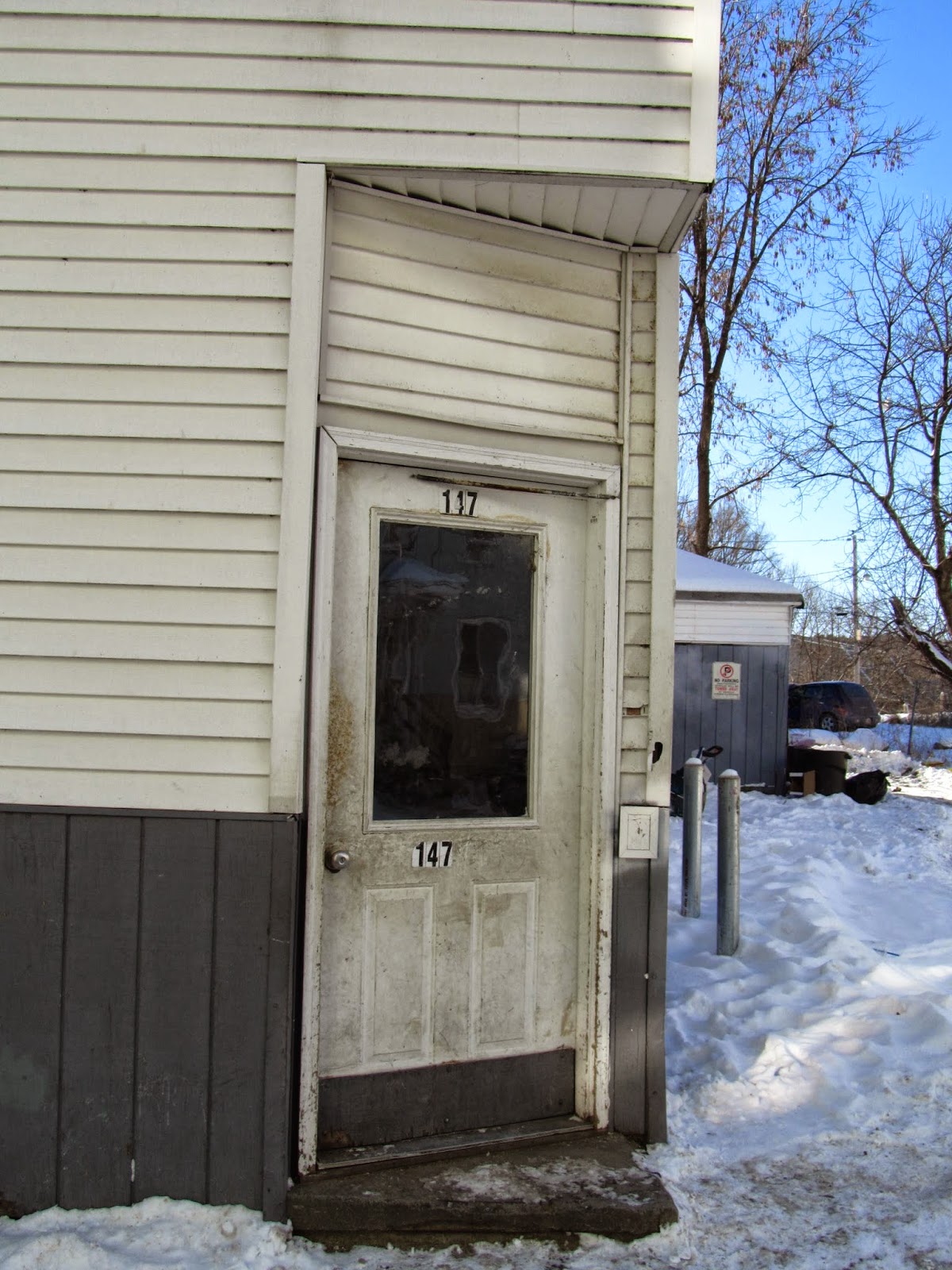 Somehow that white siding under the azure sky gave P'tit Canada an almost Mediterranean vibe. Almost. But it's grim. It's bleak. C'est pas fun. I suppose the gaps represent buildings that have burned down and not been replaced. The neighborhood a perfect illustration of that phrase, jerry-built, though it's also true that some of what's there now has managed to survive for a hundred years or so. But it's housing built fast and cheap for poor people.It was so cold the day I was there, no one was on the street. So I can't really tell who lives in Little Canada now. Somalian immigrants? Bantu? Franco Americans? I plan to go back when it gets a little warmer, and find out.