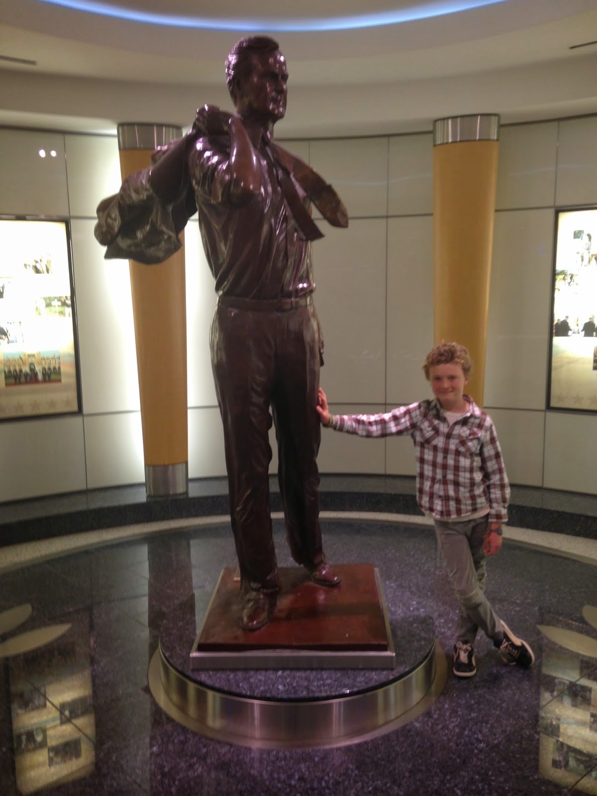 I like to think it was because I was calm, polite, and persistent that she relented at last, but maybe it was Henry looking so bewildered and concerned that wore her down. At the last moment she grabbed our bags, heaved them on the conveyor belt, and shouted at us to 'run for the gate!'. We did, and made our flight to Houston. We were worried we would miss the connection to Chicago, but that was delayed too, and at Houston we had time to check out the statue of George H. Bush. He's in a pose that was de rigeur for candidates of the era: suit jacket slung over one shoulder, sleeves rolled up, tie blowing in the wind, a tousled look. I believe it all originates in images of Bobby Kennedy in '68.