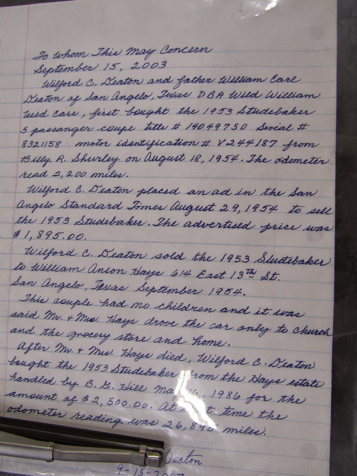 from Maynard Bray, re. the Texas 1953 Studebaker Commander: "Those were spectacularly beautiful automobiles and I wish more had survived. Anne and I had one almost like this, including the wire wheels. Here's a photo of it from around 1958."--MB