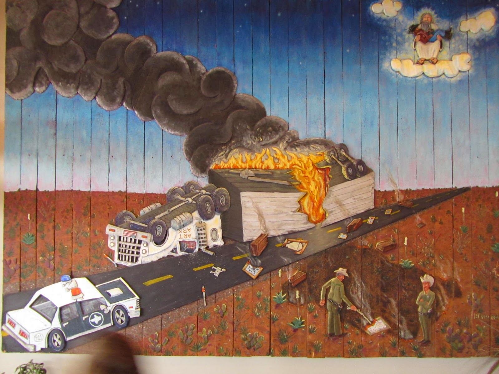 It looked like a frozen river. After an hour the sky was deep blue and cloudless, except for a single spun cloud, just north of Valentine. No traffic but we passed hulks that had careened off the highway during the night and were hung in ditches or crumpled in the yellow fields.