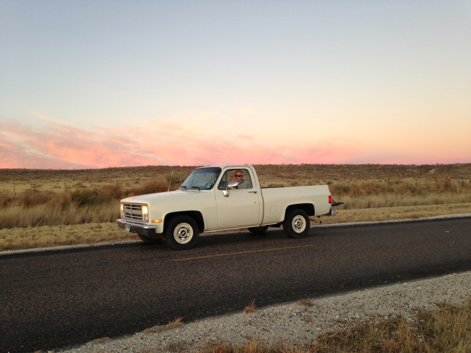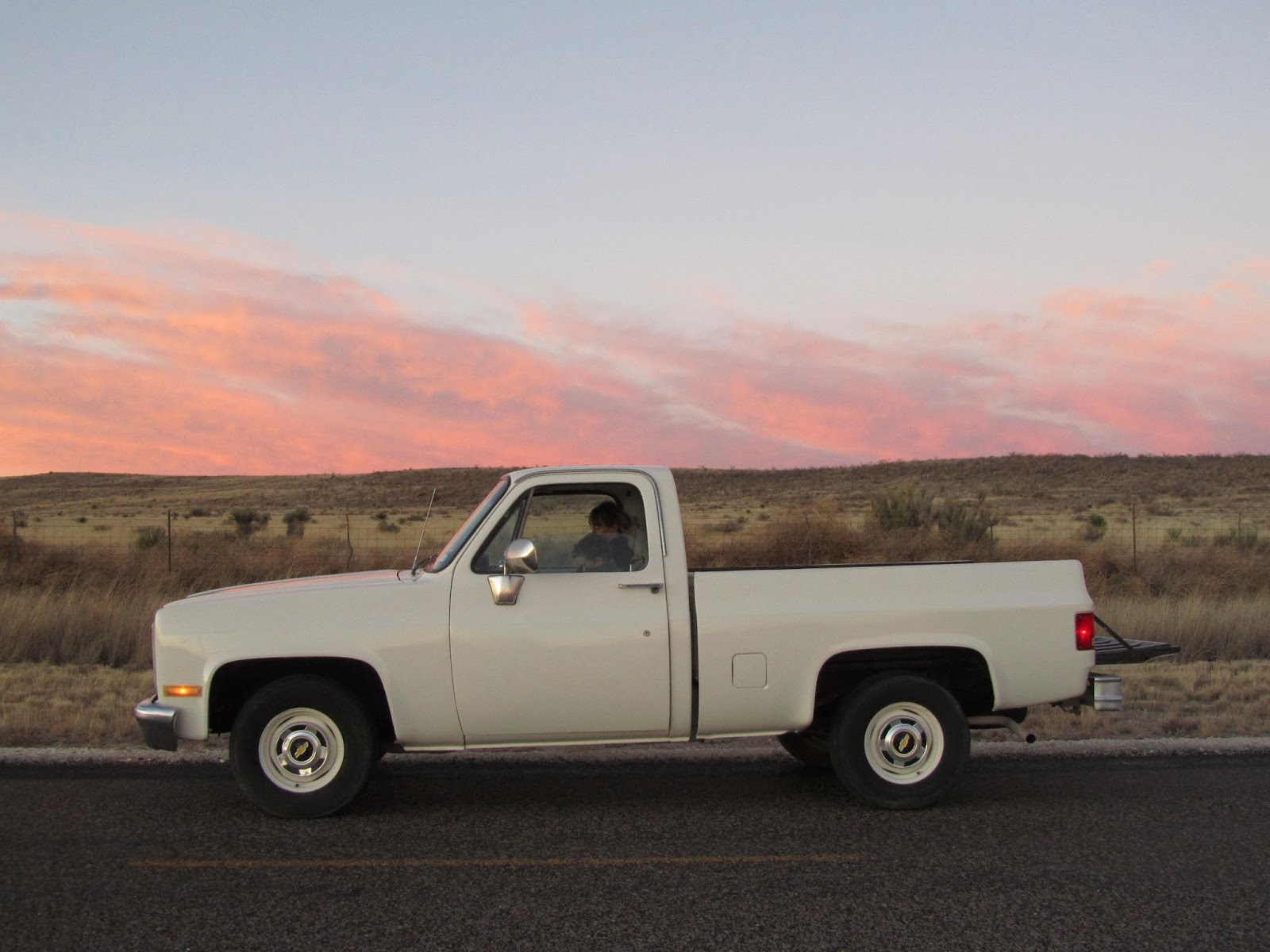 All photos Basha BurwellWe reached Marfa after an arduous travel day that started at 300AM in Maine and included a mad family dash through Houston airport to catch a flight for ELP, and a wonderful three-hour drive across the desert with our chere amie Valerie. Glad to get here. Spent our first night ever in our house. Pat Rogers had parked our Chevy outside the Texas theater on Highland Avenue. At 700AM H & I walked over in the dark and brought the truck home. Yesterday evening was glowing when we headed out on the Pinto Canyon Road.
